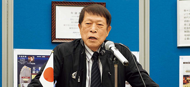 冒頭のアパグループ元谷外志雄代表による塾長挨拶では、「勝兵塾が始まってもうすぐ10年になる。毎月3カ所で開催して、これまで延べ3万人が参加した。今月号のエッセイでは新疆ウイグルについて書いた。核実験で多くの人々が被曝するなど、中国政府は非人道的なことをしてきたが、日本のメディアはほとんど報じてこなかった。中国は世界第3位の核保有国である。日本のすぐそばに強大な軍事力を持つ国があることを忘れてはならない。中国が貧しい時は豊かになれば民主化すると期待して経済援助をしてきたが、その予想は大きく外れ、経済成長とともに軍事大国となった。習近平は国家主席の任期を撤廃し、独裁体制を敷こうとしている。中国が益々力をつけてくると日本は危うい。これまでは、日本は空軍力と海軍力で中国に勝っていたが、最近では中国の空軍力は日本と同等以上となり、海軍力もつけてきている。日本の領海に侵入しても日本は警告するだけで攻撃できないことをわかっているので、中国の公船がなし崩し的に日本の領海に侵入してきている。このままではいずれ尖閣諸島は竹島のようになる。にもかかわらず、日本ではほとんど話題になっていない。尖閣諸島が中国のものとなれば、中国は太平洋への出口を押さえることができる。中国は沿岸警備隊を軍隊の下部組織に編入した。日本は十分に警戒していかないと竹島のように盗られてしまう。日本を取り巻く情勢は、世界で最もホットである。」と、中国の軍事的脅威に警鐘を鳴らしました。