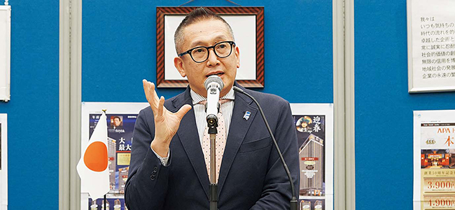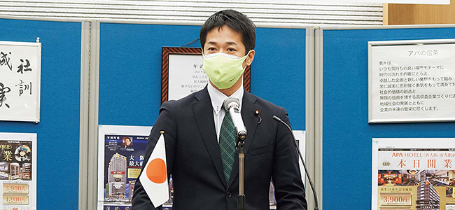 衆議院議員の佐々木紀様は、「私は石川県小松市を中心とした石川2区選出の衆議院議員で、元谷代表は高校の大先輩であり、故郷の星である。昨年9月までは安倍内閣で国土交通大臣政務官として観光庁を担当した。Go Toトラベルなどの政策にも関わったが、コロナで大変なときに、代表が真っ先に軽症者等の受入施設として手を上げてくれたことに感謝している。さらに、Go Toトラベルを推進するにあたり、アパホテルを視察して、アプリチェックインや朝食ビュッフェでの感染防止対策などの取り組みを学ばせて頂き、政策に活かすことができた。政府としては、緊急事態宣言を今月末には解除したいと思っていたが、病床の逼迫感から解除を躊躇した。3月に緊急事態宣言が解除されれば、3月下旬にはGo Toトラベルを再開できるのではないか。Go Toトラベルが全国的な感染拡大につながったと言う人がいるが、利用者数に対して陽性者数はわずかであり、クラスターも発生していないことから、感染拡大に繋がったというエビデンスはない。ただ、世論が感染拡大に敏感になっているので注意が必要である。例えば、Go Toトラベルを地域限定で再開したり、県民割を利用することから始めた方が、スムーズな再開に繋がるのではないか。今後、割引率や割引の上限額をコントロールしながら旅行需要の平準化をしつつ、観光業界を元気付けたい。Go Toトラベルを実施したことで幅広い業種に恩恵があったことから、観光業界は裾野の広い産業だと分かった。観光業界への支援は、経済対策としてもとても良いことである。観光業界を盛り上げていくためには安心・安全をどう作っていくかが大切である。そのために検査体制を拡充させ、セルフチェックでのPCR検査を安価にできるようにしたい。」と、Go Toトラベルの意義と再開への期待について語られました。