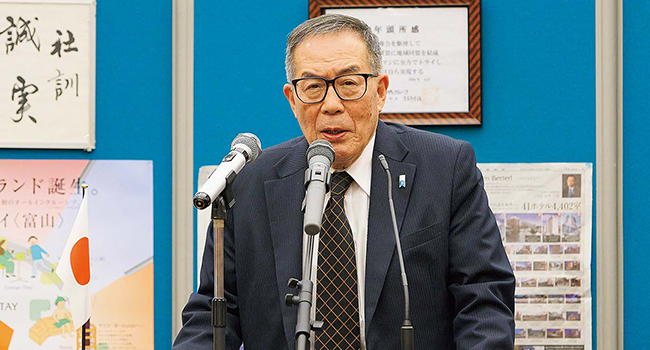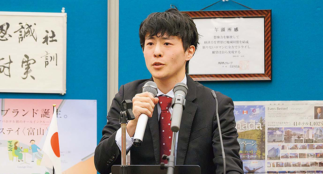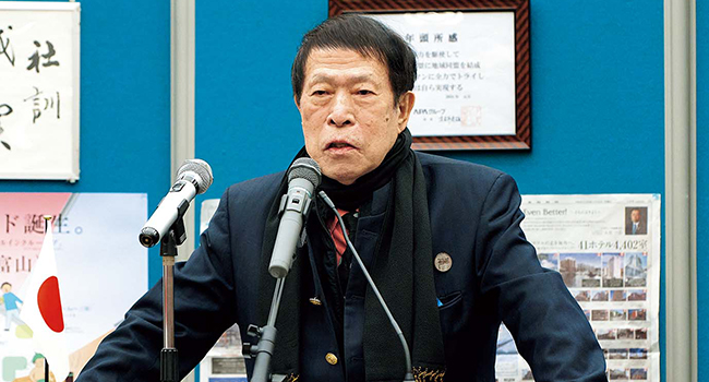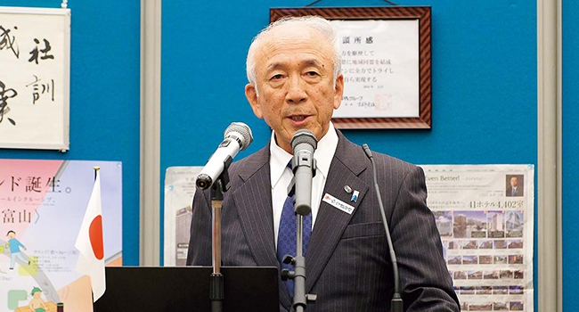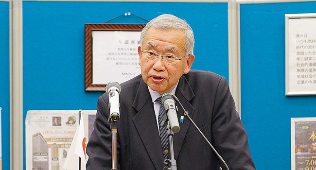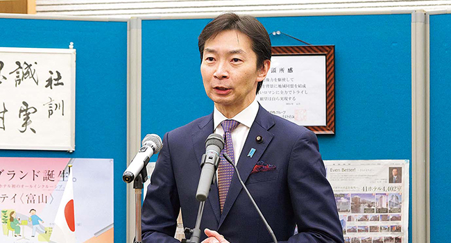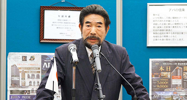 参議院議員の宮本周司様は、「石川県出身、石川県選出の参議院議員として、この度の能登半島地震に際し、発災直後から石川県庁の災害対策本部で対応に当たった。緊急時であり、指揮系統を円滑にして今すぐに救わなければいけない命を救うため、政党や会派を超え一枚岩となって復旧・復興に向け尽力してきた。避難所への物資に関しては、アパグループ様からも、自らも被災したにもかかわらず多くの物資をご提供頂くなど、多くの方々のお力添えを頂いた。初動が遅いという報道もあったが、北陸特有の冬の寒さや、余震が3日間で約500回続く中、土砂崩れや悪天候、海岸線の隆起などによって陸海空のルートに困難が生じ続け、それを瞬時に判断して手を講じ続けた初動の72時間であった。発災から2ヶ月半が経ち、各市や町が復興に向けた計画やビジョンを具現化しながら、いよいよ本格的な復興にフェーズが移行しつつある。アパグループ様をはじめ、ホテルや旅館に被災された方々を受け入れて頂いており、今も多くの方が二次避難を続けておられるが、徐々に仮設住宅や公営住宅、賃貸の活用もしながら、拠点を移しつつある。今月に入り、私は参議院予算委員会で、予算審議初日の3月4日に震災関連の質問を行ったが、その際に敢えて質問に触れなかった内容がある。能登半島の奥にある輪島市内の舳倉島は国境離島になっており、輪島市と能登町の境付近には自衛隊の輪島分屯基地がある。こうした防衛関連施設や海上保安庁の施設、原子力発電所や空港といった生活関連施設の半径1キロ圏内にそして国境離島は、何らかの施設ができて使用を阻害されてはならないため、重要土地等調査法に基づく注視区域に指定されている。震災の混乱の中で、こうした注視区域周辺や、現在まだ区域指定されていない志賀原発(稼働停止中)の周辺に何らかの悪意を持った投資がなされないよう、内閣府内の担当部署と確認をしながら進めている。このように、我々が愛する故郷をしっかりと守るという気持ちを持ち続けながら誠心努力を続けていく。」と、震災対応と日本固有の領土を守ることについて話されました。