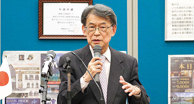冒頭のアパグループ元谷外志雄会長による塾長挨拶では、「東京・大阪・金沢の3会場で毎月月例会を約12年にわたって開催している。勝兵塾を通じ、1人でも多くの人が本当のことを知る機会を得て、正しい歴史観を認識するようになってほしい。」と述べました。