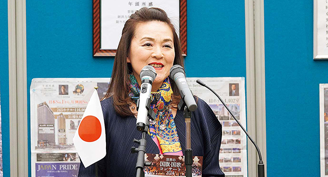 声楽家の新藤昌子様は、「オペラ歌手として35年間活動する傍ら、世界の国歌の専門家として、世界150カ国以上の国歌を原語で歌っている。2020東京オリンピックの際には内閣官房から世界の国歌アドバイザーを任命頂き、世界の国歌を歌い、教えることを公的に認可頂いている日本で唯一の存在だと自負している。現在、NPO法人世界の国旗国歌研究協会の共同代表をしており、この度、6月1日土曜日にクラシックの殿堂である紀尾井ホールで、『世界の国旗・国歌コンサート2024』を主催することとなった。独唱・合唱で世界24カ国の国歌を取り上げ、共同代表の吹浦忠正さんが国旗の説明をする形で、相互補完的にそれぞれの国について知る機会となる。海上自衛隊の東京音楽隊にもご協力頂けることとなったので、一般の音楽愛好家の方や日本の国防にご関心のある方にもお越し頂きたい。愛国心の話があったが、世界の国々では愛国心を持っていることが当たり前である。私は国歌を通じて世界を見て、日本をもう一度再興したいと考えている。」とお話し頂きました。